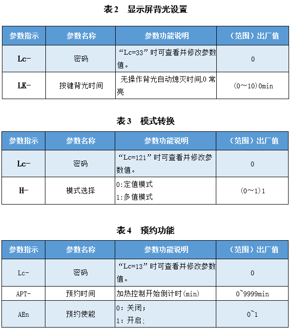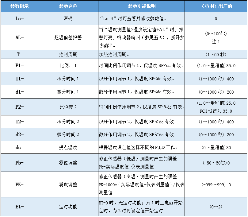 再點擊設(shè)定鍵,若密碼值不正確,控制器自動返回到正常顯示狀態(tài),若密碼值正確,則進(jìn)入到溫度內(nèi)部參數(shù)設(shè)定狀態(tài),再點擊設(shè)定鍵可以依次修改各個參數(shù)。