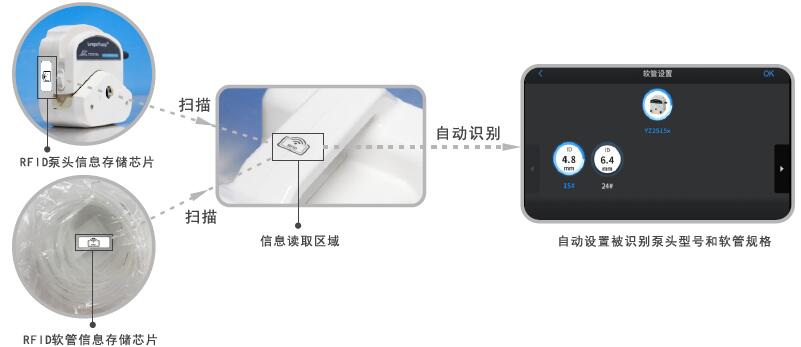 新推出的三款智能蠕動泵具有“泵頭和軟管型號自動識別”功能。通過RFID技術(shù),泵可自動讀取泵頭型號和軟管規(guī)格信息,并在運行方案中設(shè)置相應(yīng)參數(shù)。不僅幫助客戶簡化操作過程,提高工作效率,而且能夠有效保證泵頭與軟管參數(shù)的正確性,為實現(xiàn)高精度的流體傳輸提供有力支持。